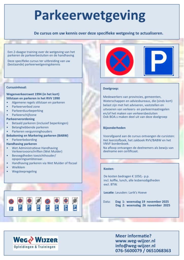 Door cursussen samen te voegen brengen we 8 cursusdagen terug tot 5 dagen. Het resultaat is (reis)tijdwinst en lagere kosten. Van de nieuwe cursus maken de volgende cursussen deel uit: – Basiscursus Verkeerswetgeving – Basis- en Vervolgtraining Uitvoeringsvoorschriften / Beheer Verkeerstekens – Beheer Verkeerstekens – Cursus parkeerwetgeving – Cursus Verkeersbesluiten Doelgroep Medewerkers van provincies, gemeenten, waterschappen en adviesbureaus, die (sinds kort) belast zijn met het adviseren, vaststellen en uitvoeren van verkeers- en parkeermaatregelen en/of het maken van verkeersbesluiten.